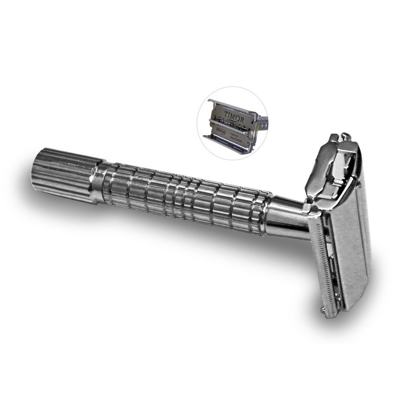 Timor razor with butterfly opening, ideal for changing the blade without risk of cutting. Made from Solingen steel in shiny chrome by Giesen & Forsthoff. Short non-slip handle. Excellent weight ratio.