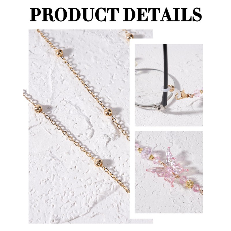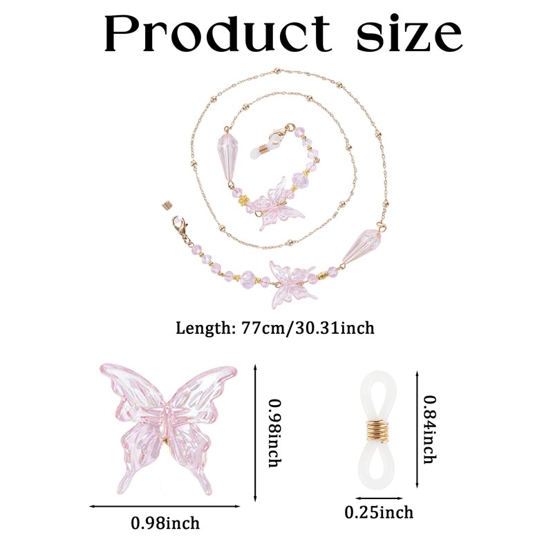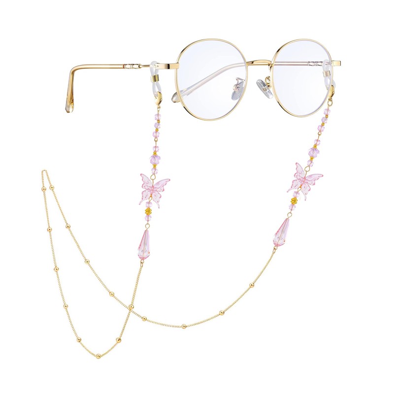 - Elegant Charm: This butterfly beaded eyeglass chain features shimmering pink crystal-style beads. The delicate butterfly-inspired details bring a graceful, vibe to your everyday look