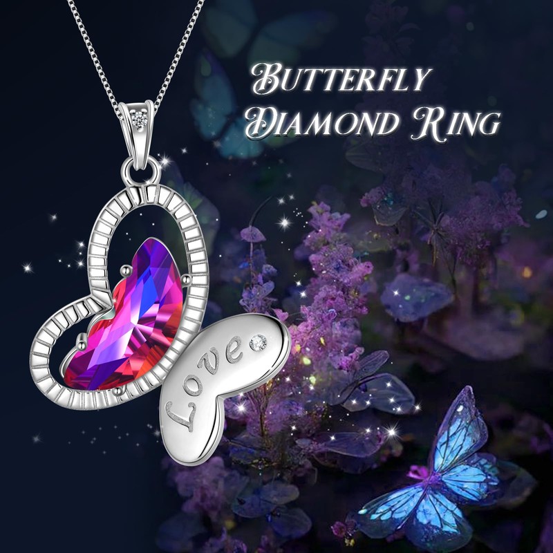 Butterfly Love Pendant Necklace - Woman 925 Sterling Silver Animal Butterflies February Birthstone Purple Crystal Necklace Jewelry Christmas Birthday Gift for Wife Mother DP0376F