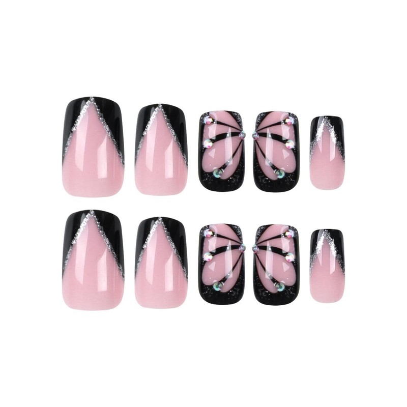 Butterfly Press on Nails Medium Square Shape Black French Tip Fake Nails Rhinestone Design Silver Glitter False Nails Glossy Reusable for Women Girls Daily Wear Manicure 24pcs