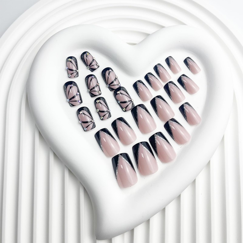 - What You Get: This set includes 24 black french tip press-on nails in 12 sizes, 24 adhesive tabs,cleaning cloth, a nail file, and a wooden stick. With various sizes and the ability to trim and shape to your preference, you'll find the perfect fit for any nail. Ideal for a custom look, these rhinestone press-on nails also make a fantastic gift for women and girls. Enjoy versatility and convenience with every set