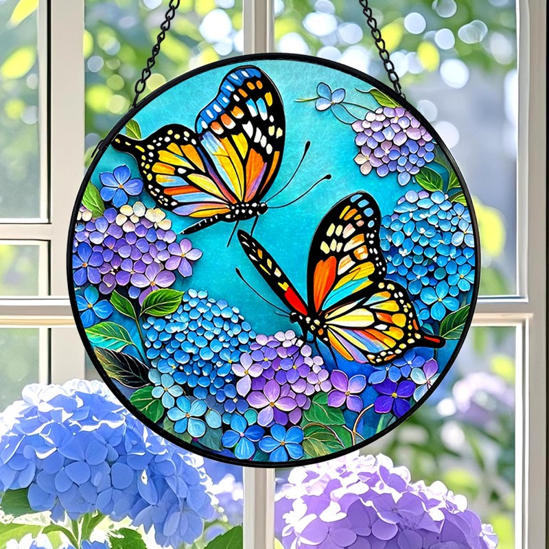 - HANDCRAFTED DESIGN: Beautiful stained glass suncatcher featuring vibrant butterflies and hydrangea flowers in stunning blue and purple hues
