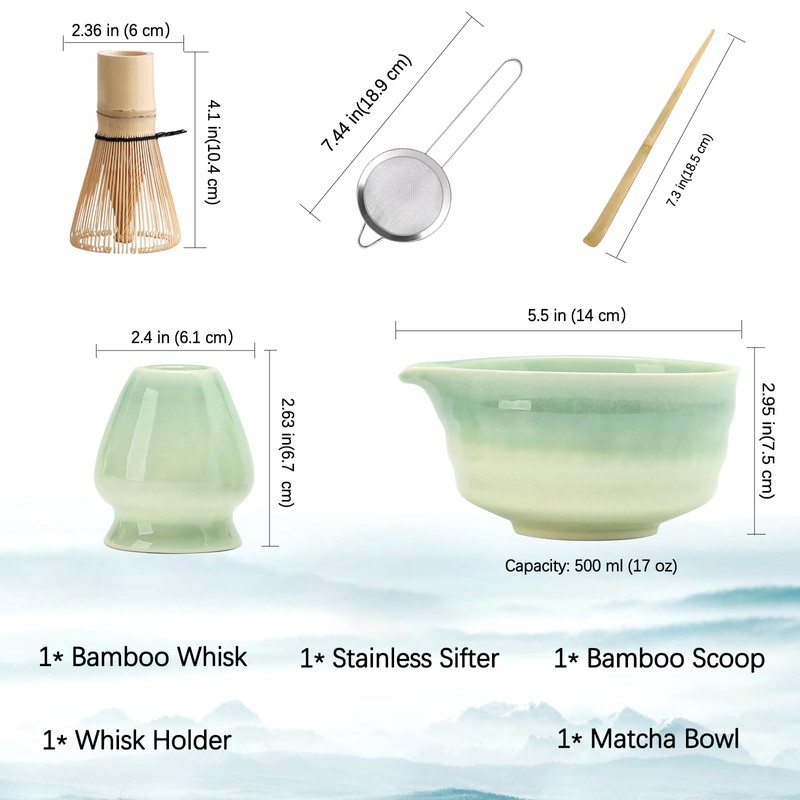 • Complete Matcha Kit: Our Pcs matcha kit includes essentials for an authentic matcha experience: Bamboo Matcha Whisk, Bamboo Scoop, Stainless steel sifter, ml/ oz Ceramic Matcha Bowl (Chawan), and Whisk Holder. Each tool is crafted with precision, designed to make your matcha lifestyle effortlessly stylish. Elevate your tea ritual with our thoughtfully curated collection, perfect for both enthusiasts and newcomers to the world of matcha.