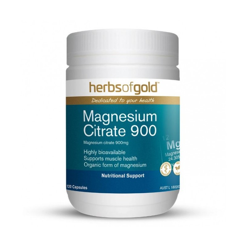 Herbs of Gold Magnesium Citrate 900 provides an organic form of magnesium to maintain healthy muscle contraction function and nervous system health. Magnesium citrate is a well-absorbed form of magnesium and helps to prevent dietary magnesium deficiency.