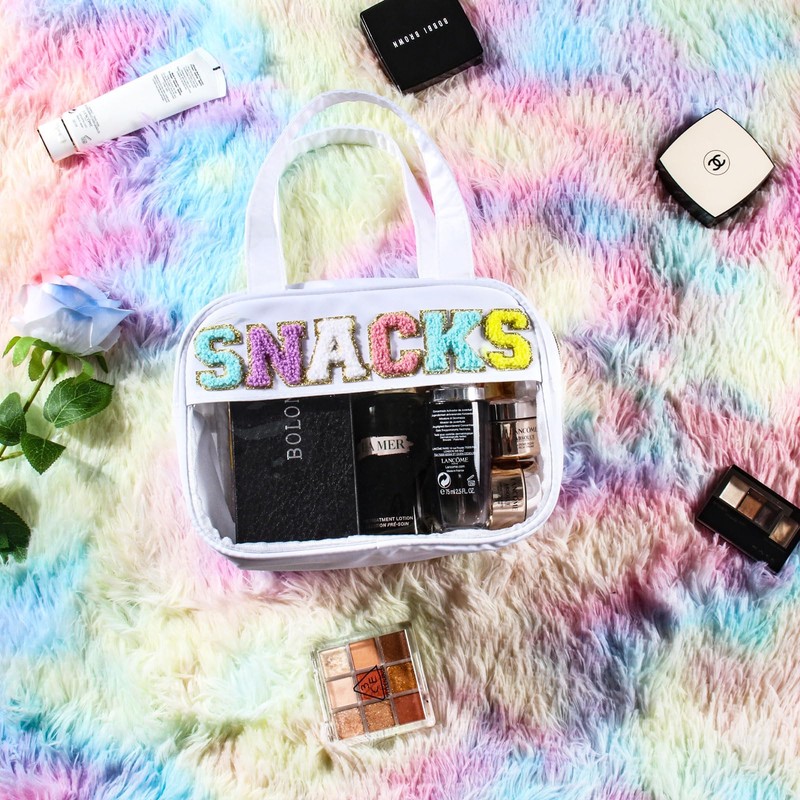BuyCard Chenille Letter Clear Makeup Bags, Clear Snacks Bag for Travel, Preppy Patch Nylon Cosmetic Bag with Handles and Zipper, Waterproof Large Clear Travel Toiletry Bag Storage Bag for Women White
