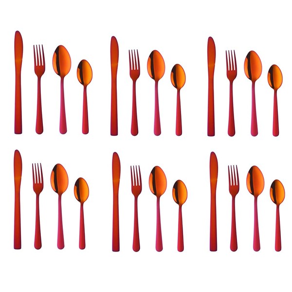 - Package: One Set included 6pcs Dinner Knives, 6pcs Dinner Forks, 6pcs Dinner Spoons, 6pcs Tea Spoons, service for 6. Color: Rainbow Red (High temperaure contact/palced in water, turing different red as photo)