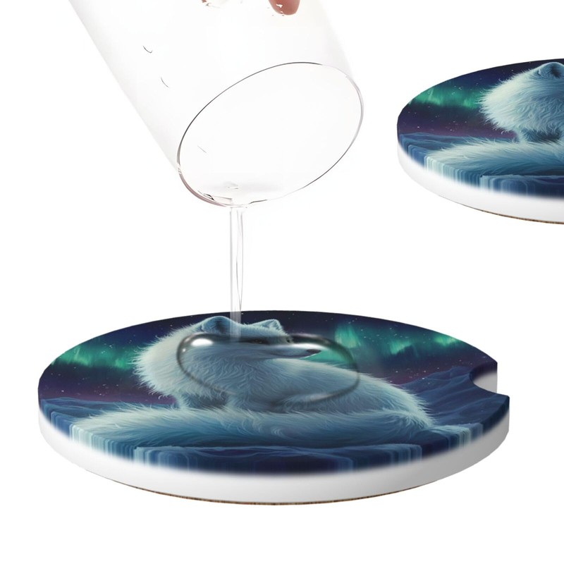 Buyidec Arctic Fox Absorbent Car Coasters 2 Pack Cup Holders, 2.56" Ceramic Stone & Non-Scratch Cork Base Drink Coasters Cute Car Assecories for Women Men