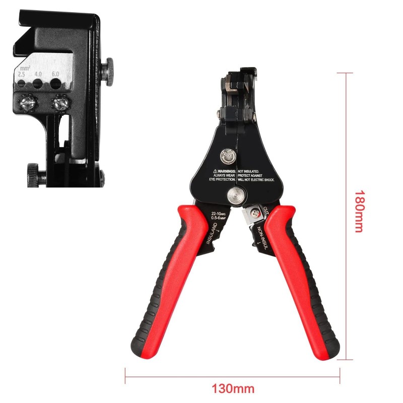 - Button design: adjustable cable stripper equipped with a self-adjusting jaw positioner, you can adjust the stripping length while rotating the knurled wheel fine tuning knob to accurately adjust the tension and gap of the jaws and have the perfect control tension when stripping. Ideal for one-handed operation and long working hours. Crimping range: 2.5-4-6mm² (AWG13-11-10)