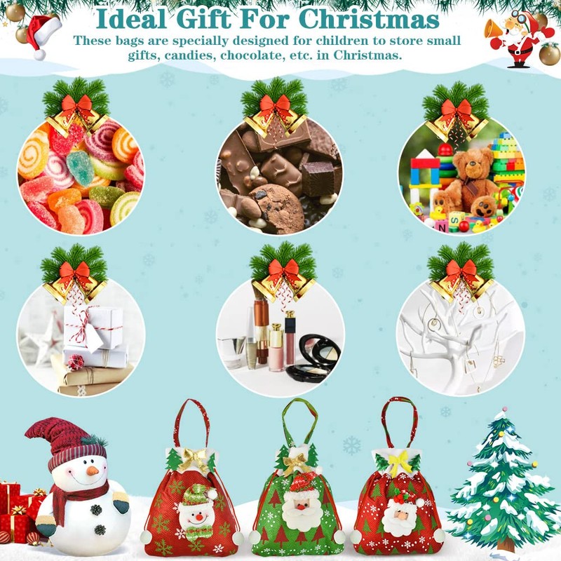 - Suitable for wrapping all kinds of Christmas gifts: This Christmas bag is beautifully crafted and perfect for decorating and wrapping your Christmas gifts for children or friends. Such as chocolates, sweets, apples, snacks, etc. It is also suitable for other festivals or parties. Such as wedding parties, birthday parties, etc. A perfect replacement for wrapping paper and ribbons, both good looking and environmentally friendly