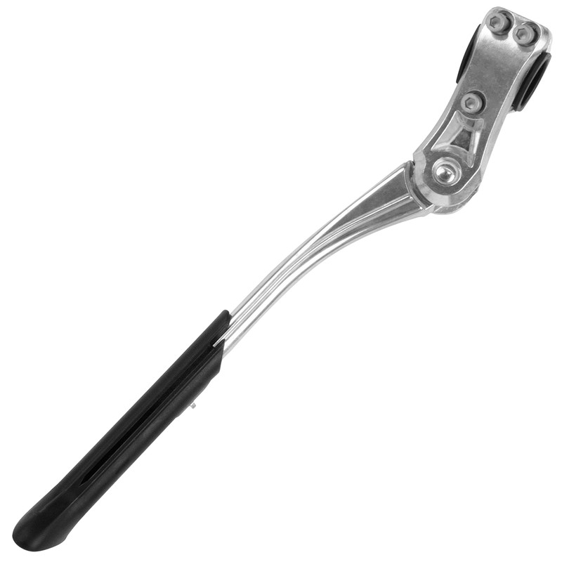 BV silver rear kickstand for bicycles. Kickstand fits on rectangular and oval tube chain stays (22mm-28mm). This kickstand is suitable for mountain or trekking bikes. Its adjustable design and plastic adjustable piece will keep the bike standing securely. Adjustable height for bicycle sizes 24 in -28 in.