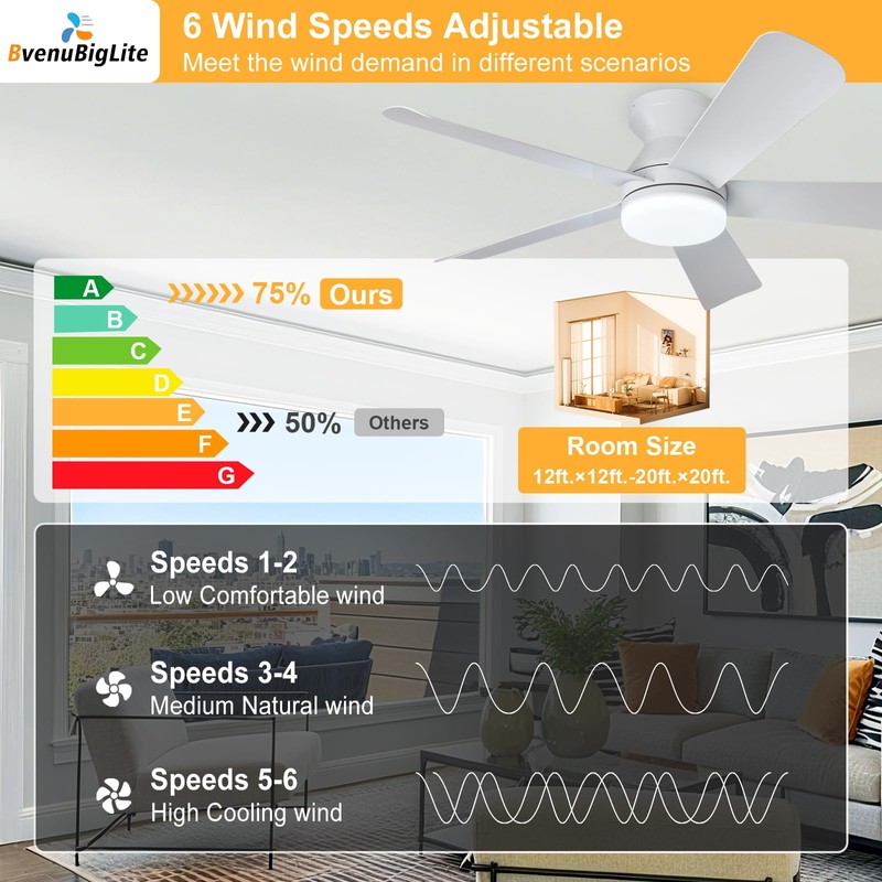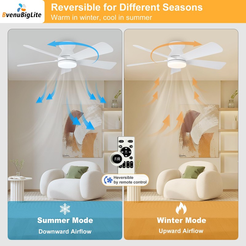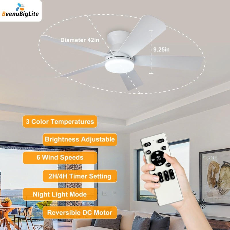 - 【Modern Ceiling Fans with lights and Remote】BvenuBigLite 42'' ceiling fans with lights can be controlled via a multi-functional remote control, bringing convenience to your life. Not only can you adjust 3 light color temperatures (3000K-6500K) and brightness (10%-100%) of the light, but also set 6 wind speeds and 2H/4H timer. You can also set the reverse mode of the fan blades. In addition, the White ceiling fan with light can also be set to a night light mode, providing you with a comfortable sleeping environment.