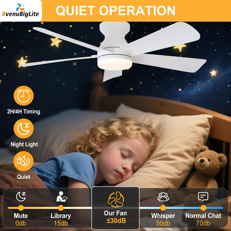 BvenuBigLite Modern Ceiling Fans with Lights: 42in Low Profile Ceiling Fan with Light and Remote - White Flush Mount Ceiling Fan for Bedroom Reversible 3CCT Dimmable Timer Quiet Indoor/Outdoor Use