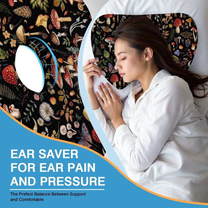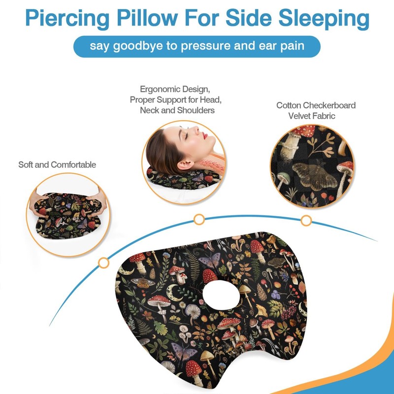 - Our curved pillow has an innovative design with a center ear hole leaving enough space to ensure the proper protection and cushion of the new piercing/pain ears. Not just the right amount of support for the head, but protect our ears.