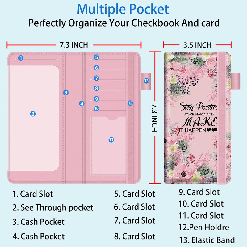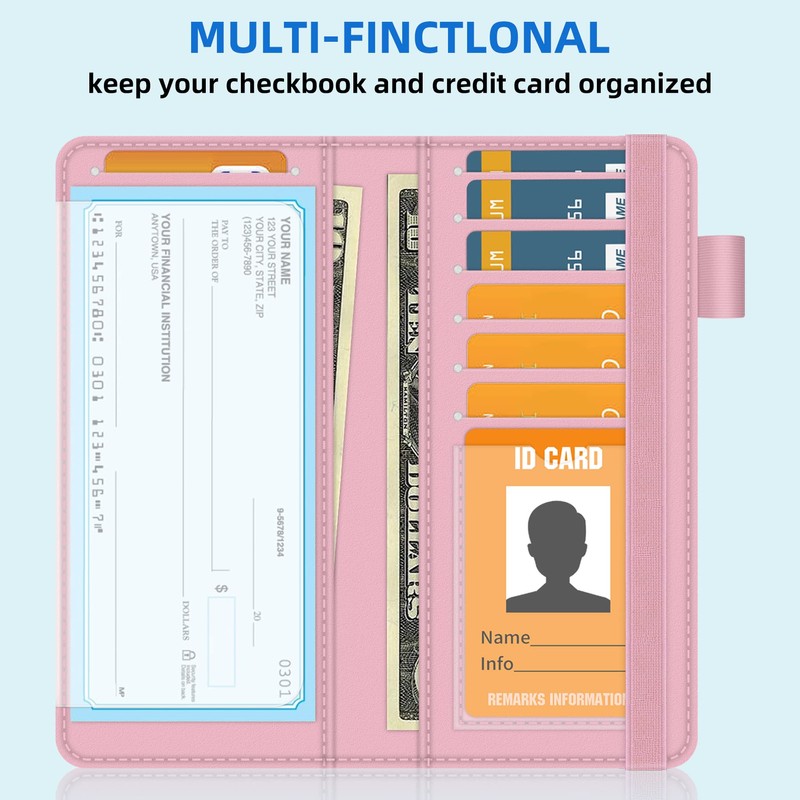 - COOL CONSTRUCTION: Our check book organizer with 1 ID crad slot, 7 credit card slots, 2 large pockets for checks, registers, bills, receipts and so on. 1 transaparent film part for you to put your ready-to-go checks and files for quick access. A pen holder design for the check book cover which can meet your daily use. With a elastic strap to keep the check book cover close securely without worring about the items to fall off.