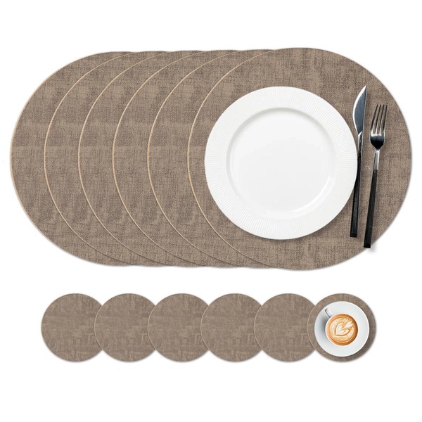 BWBIKE Round Placemats Set of 6, Faux Leather Place Mats with 6 Matching Circle Shaped Coasters Washable Wipeable Table Placemats Heat Resistant Non-Slip Table Mats, Coffee
