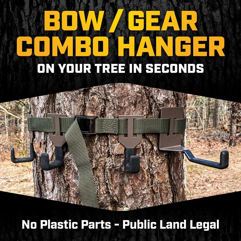 - 3 - Wide: 1 1/2" Gap, Lay-Flat, Heat Treated Steel, Gear Hangers and a Great No-Wobble Bow Hanger - that Will Not Bend! - Purpose Built Quality - Made to Last a Lifetime - No Matter What treestand You Hunt our of, You need a Great Gear and Bow Hanger