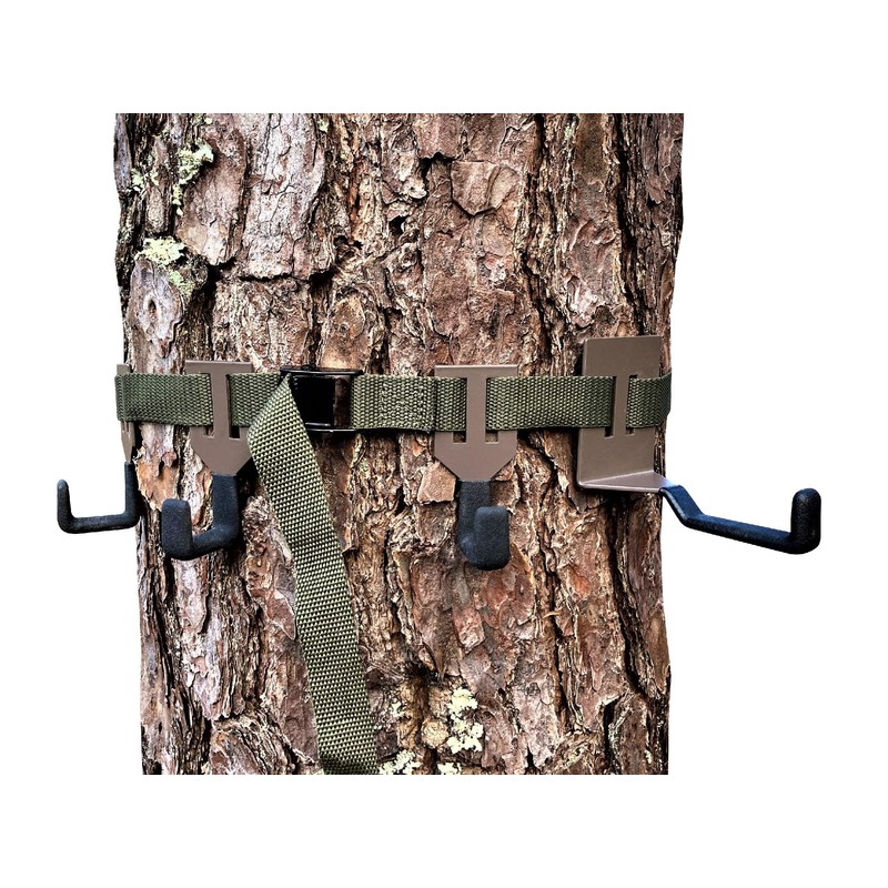 - N0 Plastic Parts - All Quality Metal Construction. No More Worries, about hanging your Bow, heavy Pack or valuable Camera and Binoculars on a weak screw in hook or plastic hook and plastic buckle assembly. The Perfect Hanger for Saddle Hunting, Mobile Hunting, and all Treestand Hunting - On your Tree faster than 1 Screw-In Hook -Make Your Set Up Simple! The End of Screw-In Frustration!
