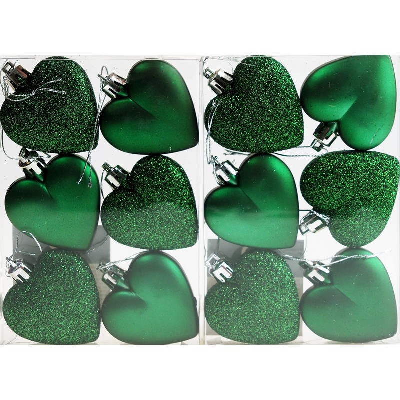 BWG Set Of 12 x Love Heart Christmas Tree Baubles - Deep Emerald Green