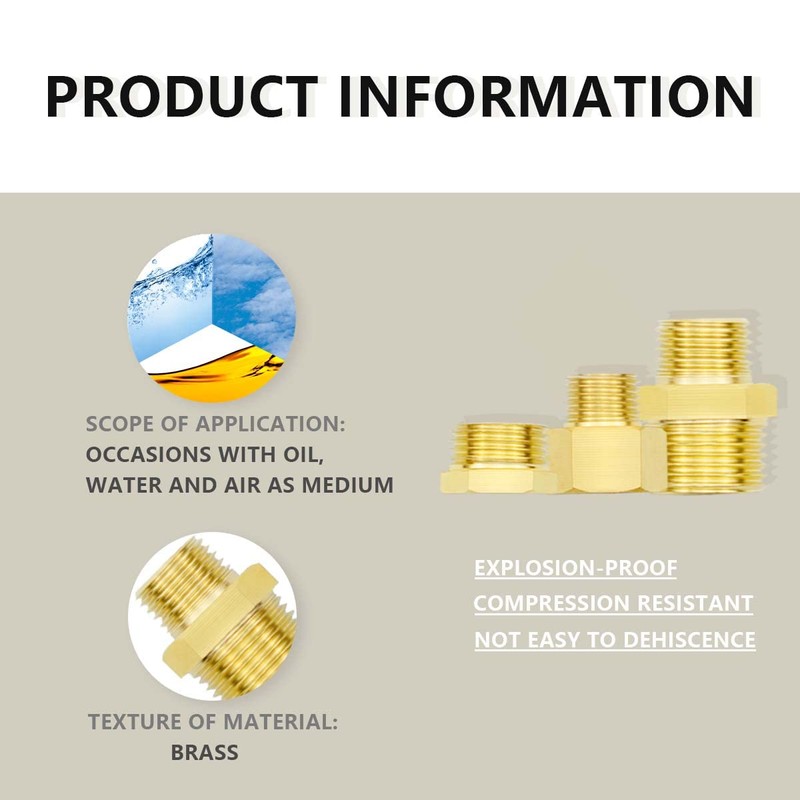 -Advantages-【Reliable Quality】: Made of high-quality brass, it is not easy to rust and wear, and can be used for a long time.【Wide Range Of Adaptation】: It is suitable for the size and size conversion of the pipe connection between gas and liquid, and changes the size to meet the connection between various joints.【Operating Parameters】: Please work under the air pressure below 10 bars, the normal temperature range is -50 to 120 degrees Celsius.【Quick Installation】:It is recommended to wrap the raw material tape on the threaded port before connecting, and the corresponding thread can be used after screwing in, without the trouble of leakage.-Specification-Material:brassConnector: BSP thread-Package Includes-6 pcs pipe connectors