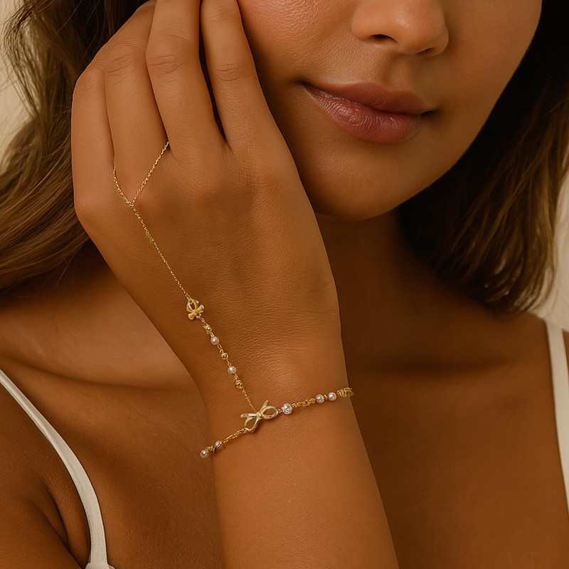 BXDA Gold Bow Pearl Hand Chain Ring Bracelets for Woman, Dainty CZ Rhinestone Bead Chain Finger Ring Slave Bracelet Adjustable Summer Beach Jewelry Gifts