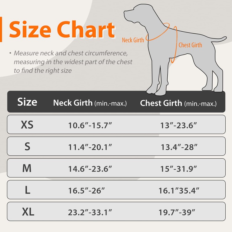 XL: Neck 23.2"-33.1"/Chest 19.7-39"
