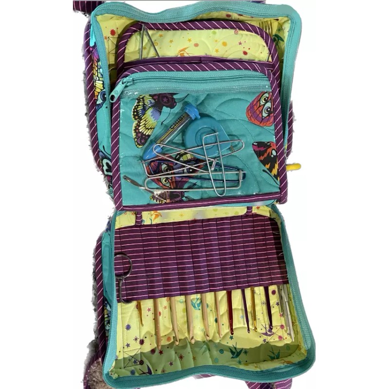 Divided pockets hold dozens of crochet hooks and interchangeable knitting needles and directions are included for customizing the bag to suit your needs.