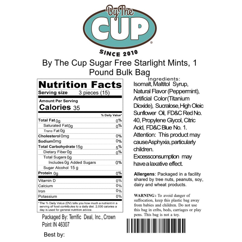 - 1 lb Bag of By The Cup Sugar Free Starlight Mints (Excess consumption may have a laxitive effect)