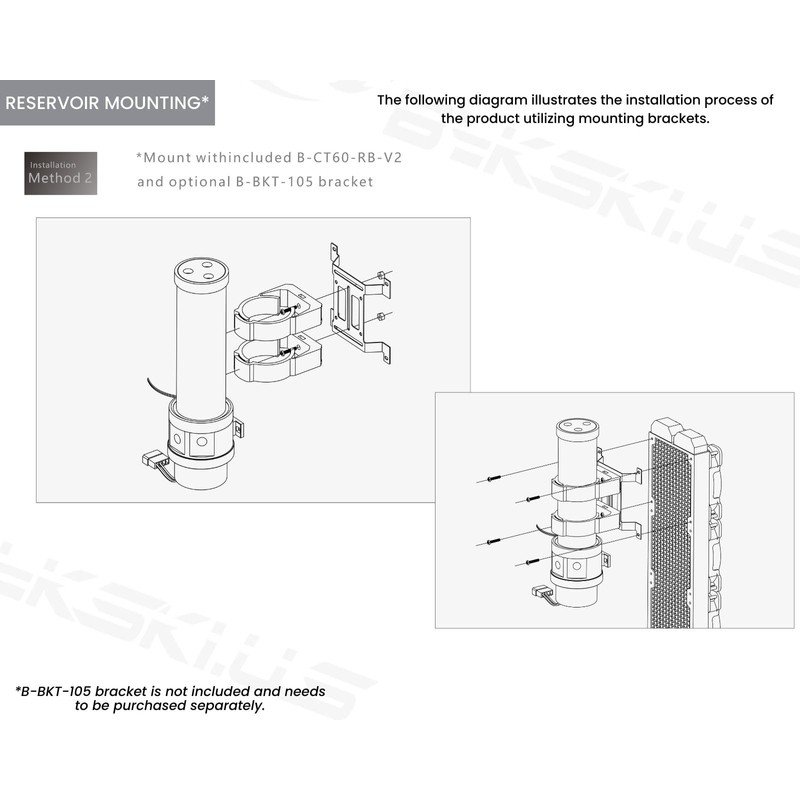 Elevate your PC's cooling efficiency and aesthetic appeal with the Bykski D5 Pump and 60mm PMMA Reservoir Combo. This high-end, reliable combo is engineered to provide superior water circulation and a stunning visual display, thanks to its 5V addressable RGB lighting. Designed for enthusiasts seeking top-tier performance in their custom cooling solutions, this unit offers precision, durability, and style.FeaturesHigh-Efficiency D5 Pump: Known for its exceptional performance and reliability, the D5 pump ensures optimal coolant flow through your system.Sleek 60mm PMMA Reservoir: The clear PMMA reservoir is not only tough but also allows for easy monitoring of coolant levels and adds a touch of sophistication to your build.Addressable RGB Lighting: With a 5V RGB connection, customize your lighting to match your system's aesthetics with vibrant, dynamic color effects.Quiet Operation: Engineered to minimize noise, the pump-reservoir combo runs smoothly, ensuring a tranquil computing environment.Durable Construction: Made from high-quality materials, this combo is built to last and withstand the rigors of continuous use.Easy Installation: The unit comes with a comprehensive mounting kit, making it easy to integrate into your custom loop.SpecificationsModel:CP-NWD5-X-CT60-V3Pump Type: D5Reservoir Material: Engineered Plastic + PMMA + Aluminum alloy (not in contact with coolant)Reservoir Size:60mmColor:Clear/BlackRGB Type: 5v Addressable RGB (RBW)Connectivity: 4-Pin Molex and PWM+ data feedbackMounting Kit: Included for easy installationHeight Dimensions: 151mm (total) | 60mm (reservoir only)Width Dimensions: 81mmPower Input: DC12v, TDP18W, RPM 4800Flow Rate:1100L/hParts Included1x PMS5 Pump (installed)1x Reservoir + Top1x Pump Armor (installed)2x Mount Brackets + Screws1x 5v Addressable RGB (RBW) -Controller not included(Warning: Addressable RGB (RBW) is 5V and is ONLY compatible with A-RGB (RBW) components. RGB is 12V and is ONLY compatible with RGB components. Mix and ma