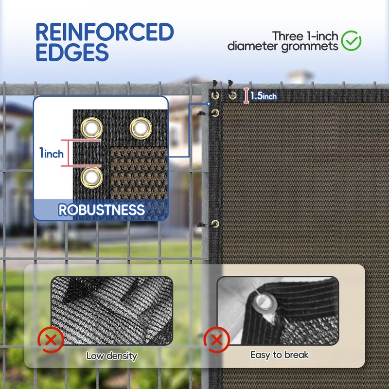 This privacy fence screen is made of high density polyethylene (HDPE) fabric with durable binding and brass grommets on each side.