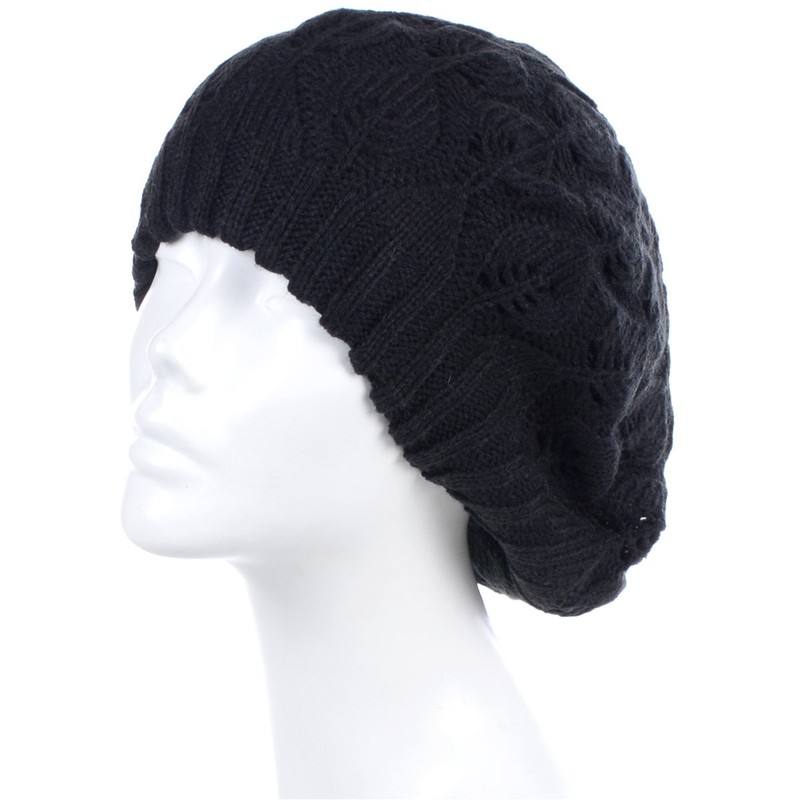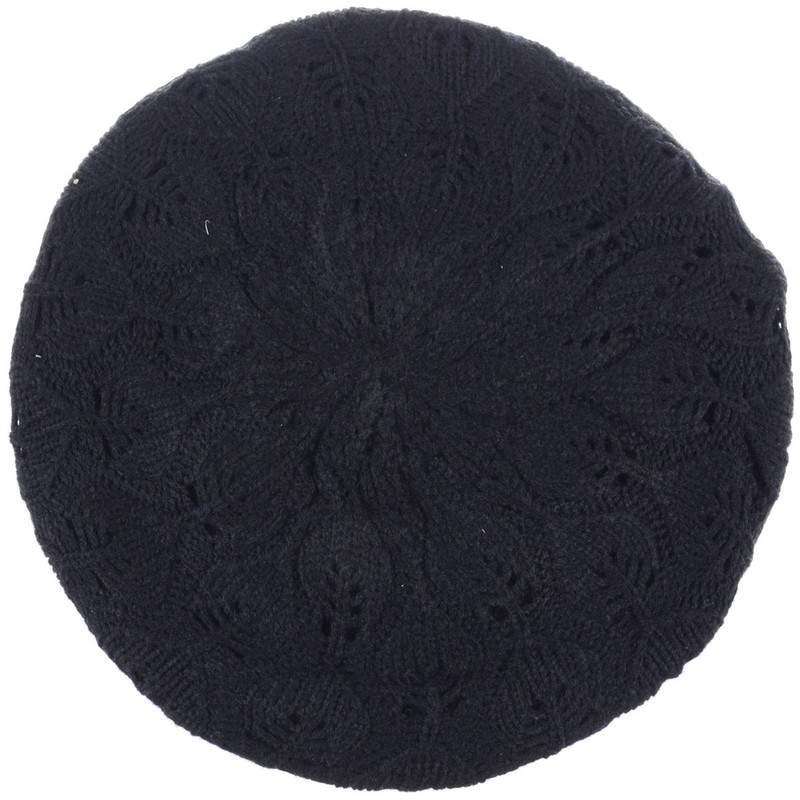BYOS Winter Chic Leafy Cutout Crochet Knit Slouchy Beret Beanie Hat, Double Layers (Black)