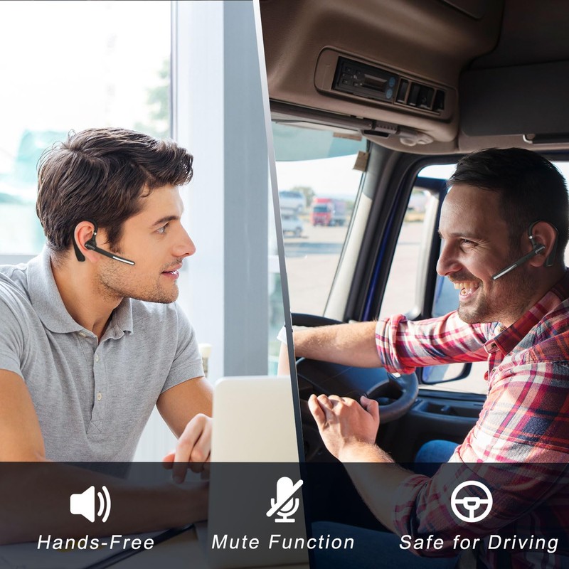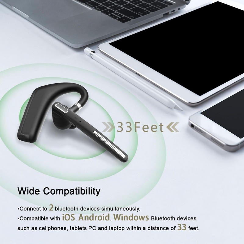FeatureDual Mic Noise ReductionFast Bluetooth Connection2 Devices Connection SimultaneouslyOne Press to Activate SiriAnnounce CallerWide CompatibilityNo Extra App NeededTure Hands-Free CallingBluetooth Phone Headset Compatible for iPhone, Samsung, HTC, LG, SONY, Huawei, iPad, PC Tablet, Laptop, etc.Bluetooth Earpiece Suitable for Office, Business, Truck Drivers, etc.