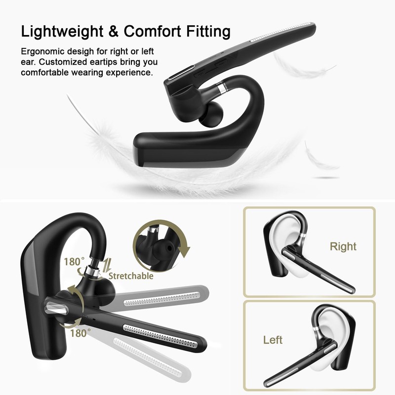 - ERGONOMIC COMFORT DESIGN:The ultra-lightweight earpiece features 360° rotatable components including adjustable boom mic and retractable ear hook. Comes with 3 sets of interchangeable ear tips (2 styles) for personalized fit. Our comfort engineering makes extended wear virtually unnoticeable.