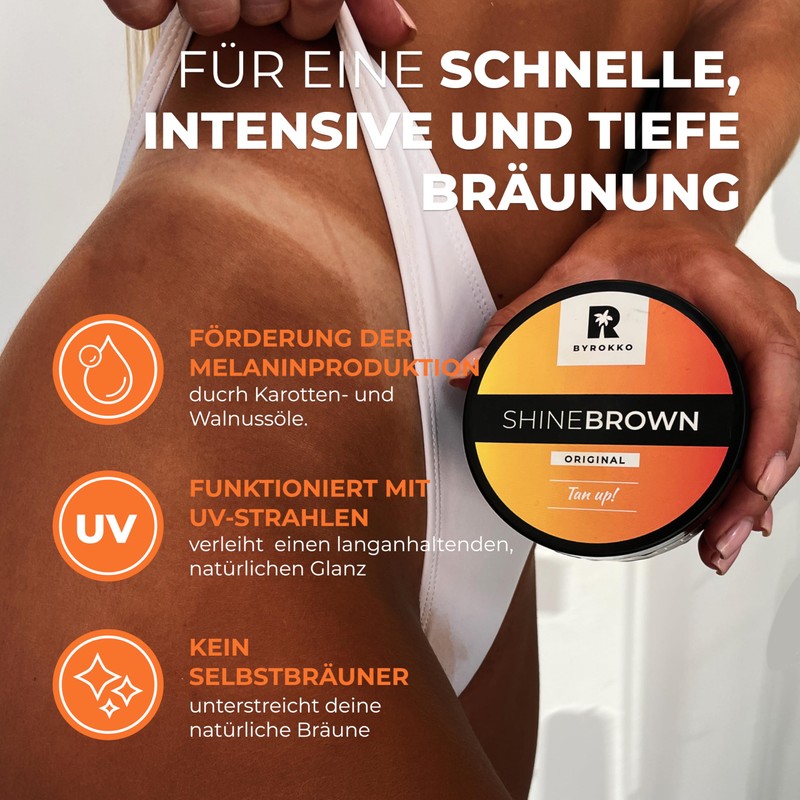 - Wenn Sie Shine Brown einmal ausprobiert haben, wird es zu Ihrem unentbehrlichen Br?unungsprodukt werden, denn wir haben an alles gedacht, was Ihre Haut braucht, um die besten Br?unungsergebnisse zu erzielen.
