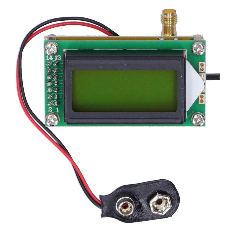Functionality: 1. Thanks to the SMA jack input (female), higher reliability and durability. 2. The test frequency range is wide and ranges from 1 to 500 MHz with a resolution of 100 Hz. 3. LCD display with backlight, the color of the backlight is usually yellow-green.4. Powered by a 9V battery (not included), low power consumption, easy to use. 5. Standard interface, can be easily connected to other test leads or antennas. Specification:Item Type:Frequency Meter Material: PCB + FR4 Colour: dark green. Power supply: 9V battery (battery not included) LCD display size: approx. 38mm x 16mm Product size: approx. 60 x 33 x 26.5mm Frequency range: 1~500MHz, resolution of 100Hz Package Content: 1 x Frequency Meter