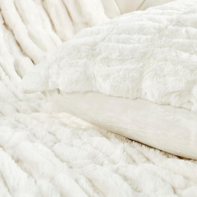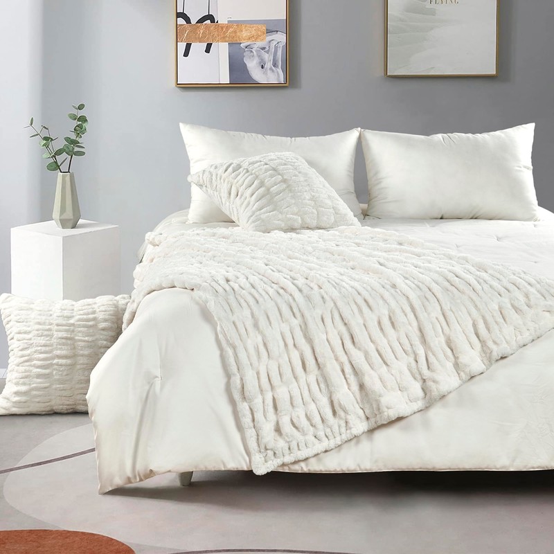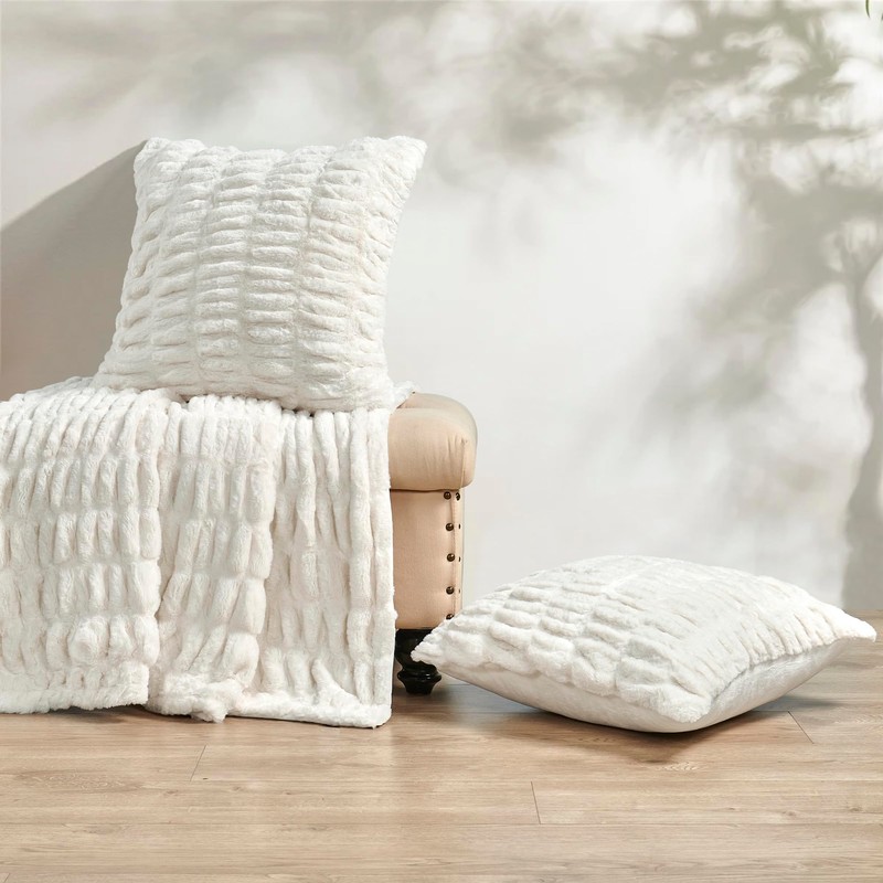 BYTIDE Ruched Faux Fur 60" x 80" Plush Throw Blanket with Two 20" x 20" Pillow Covers (NO Insert) 3 Pcs Set, Soft Fuzzy Furry Throw with Velvet Back for Couch Bed Chair, Cream