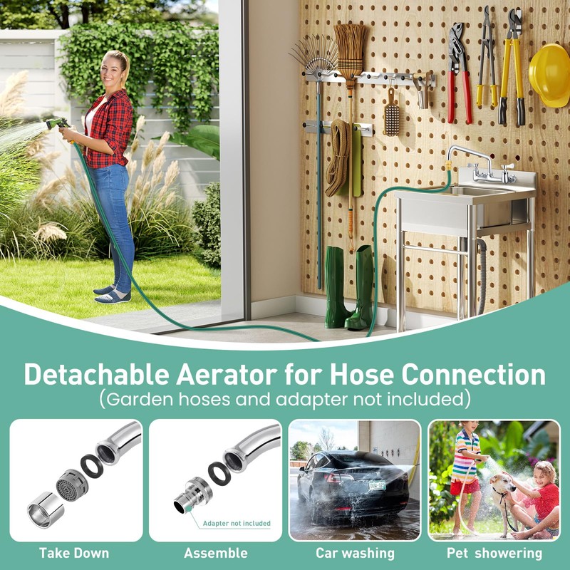 • Where You Can Use It: This commercial faucet works great in lots of places – like restaurants, commercial kitchens, gyms, laundries, farmhouses, backyards, and gardens. You can also hook up a garden hose right to the faucet spout for cleaning floors, cars, or even your pets. (Adapter and garden hose are not included)