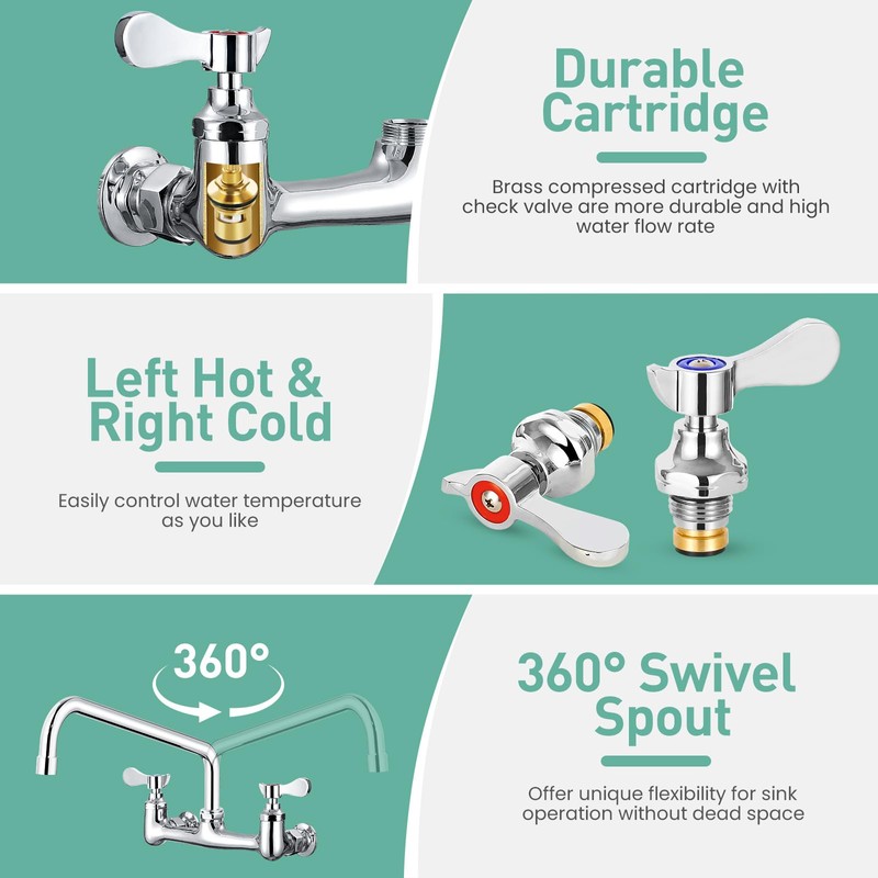 • 360° Swivel Spout: Clean Every Corner Effortlessly - The 8” utility sink faucet spout rotates freely 360 degrees, letting you easily reach every spot in the sink (perfect for sinks with dividers!). Drastically speeds up cleaning in busy commercial kitchens.