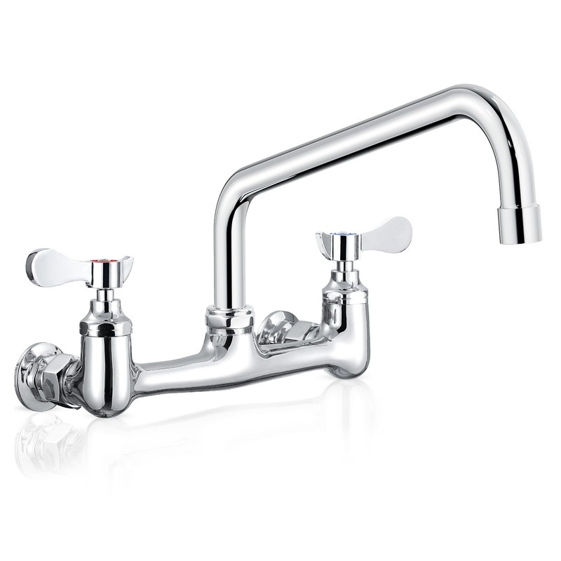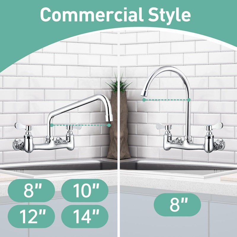 • 8-inch adjustable spread (fits holes 7.75 inches to 8.25 inches apart), includes 90° adapters to tweak the setup for your space. This kitchen sink faucet is made for a 2-hole, wall-mounted setup and comes with all mounting hardware. Just install it following the included instructions.