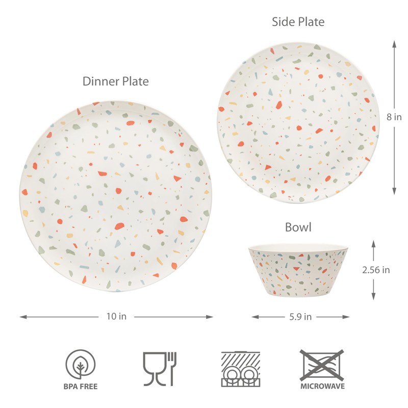 Bzyoo 12-Piece Melamine Dinnerware Set - White Confetti | Lightweight, Durable, BPA-Free | Dishwasher Safe Dish Set for Indoor & Outdoor Use - Perfect for Camping, BBQs, Kids Parties