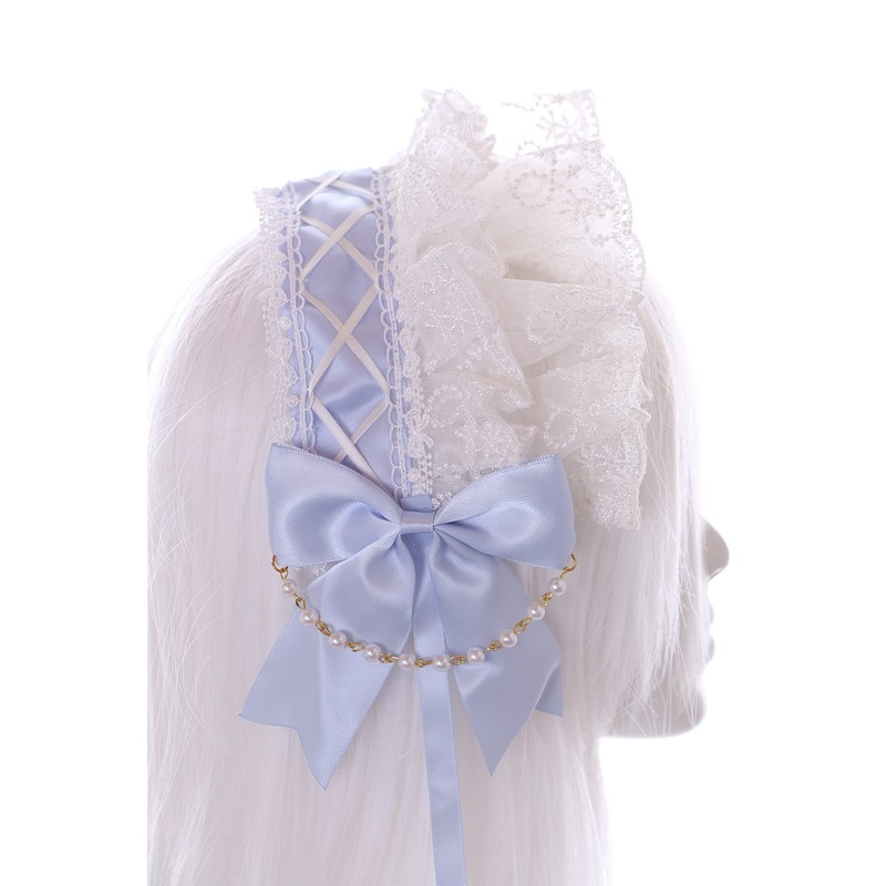 C-06-7 Light Blue Braid Maid Lolita Headband with Bow Pearl Necklace Gothic Hair Accessories