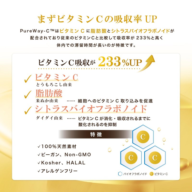 - ビタミンCをサポートする成分としてバイオペリン、αリポ酸、植物性プラセンタ、ヘスペリジン(ビタミンP)、ビタミンB3(ナイアシン)、ビタミンB5(パントテン酸)、ビタミンA、ビタミンEを配合しています。