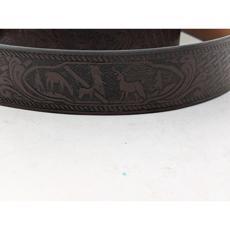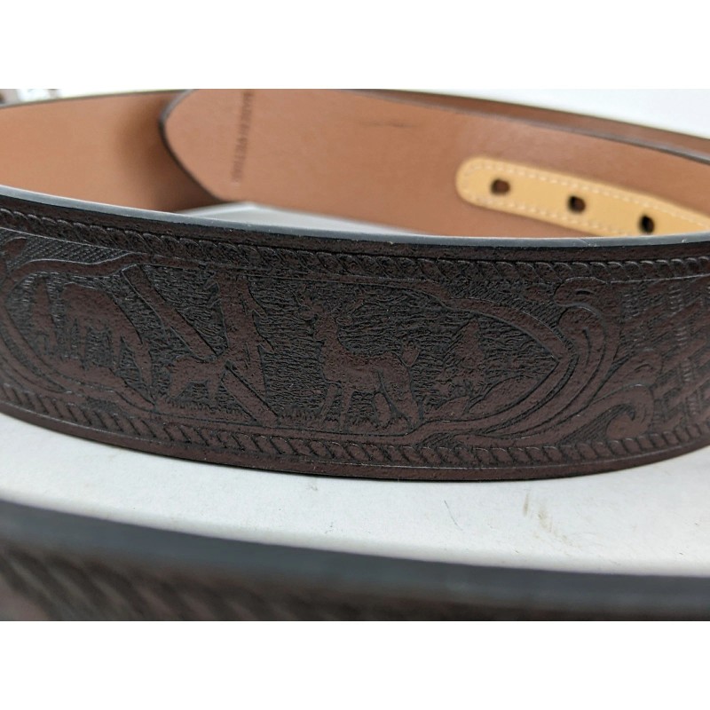 Keywords: Mens belt, Leather belt, Western belt, Cowboy belt, Deer scene belt, Embossed belt, Brown belt, Size 44, C.E. Schmidt, Workwear, Rustic, Outdoors, Buckle belt, Silver buckle, New with tags