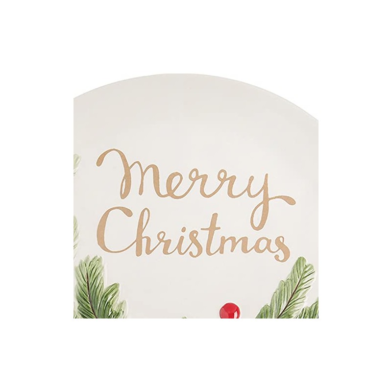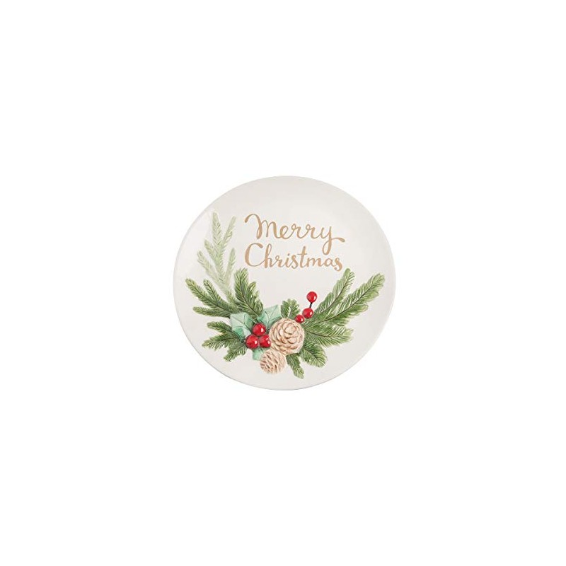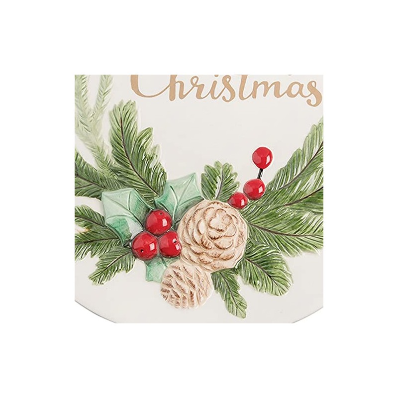 C&F Home 13" x 13" Merry Christmas Handpainted Round Dolomite Platter with Pinecone Accents 13.07" x 13.07" x 1.18" White