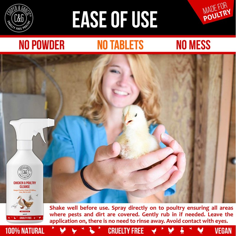 - NATURAL INGREDIENTS - Here At Cooper And Gracie, Were Devoted To Providing 100% Natural Pet-care For All Pets. There Are No Chemicals, Parabens Or Potential Irritants In Our Chicken And Poultry Cleanse Spray. Just High Quality, Ethically Sourced Plant-based Ingredients. Nothing Else. This Makes Our Spray Entirely Safe For Use On Sensitive Poultry Skin To Remove Mites And Lice, Keeping Your Chickens Clean And Healthy.