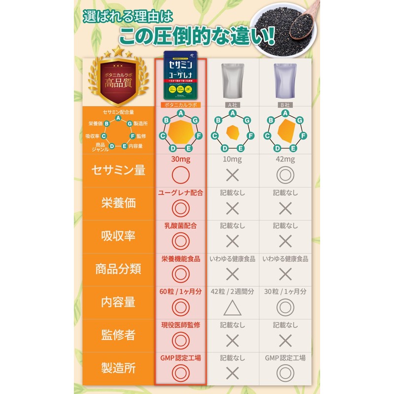 - 🌿現役医師が監修 セサミン30mg(ゴマ9,000粒分)に加え、ユーグレナ、生きた乳酸菌、ビタミンCが一緒に取れる「オールインワン・サプリメント」です。
