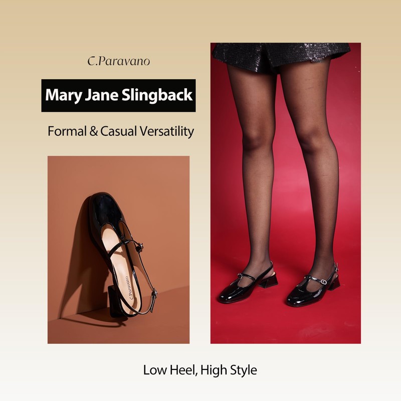C.Paravano Mary Jane Slingback Pumps Round Toe Low Heel Mary Janes T Strap Slingback Heels Block Heel Mary Janes for Women Sling Back Black