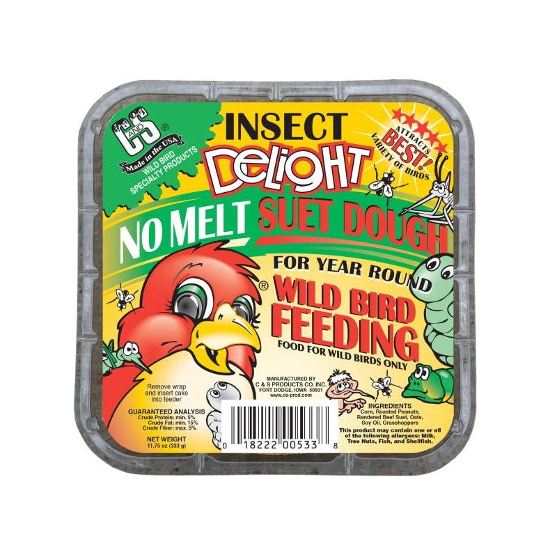 C&S Insect Delight is a No Melt, No Waste, No Mess suet that will attract the "BEST" variety of wild birds. C&S's process, unlike others who pour their dough into a tray, creates the only true no melt product line on the market today. This product will make a great addition to your backyard buffet resulting in successful "Year Round" wild bird feeding in all types of weather.Wild Bird Suet is traditionally fed in vinyl - coated wire cages. They are inexpensive and durable. Wire dimensions vary depending on how starling or squirrel resistant you want your feeder to be. The cages, or baskets, hold from 1 - several C&S Suet Cakes or Bricks. The cages may be hung from branches, tree trunks, or hooks. There are also several designs available combining wire with wood or plastic.