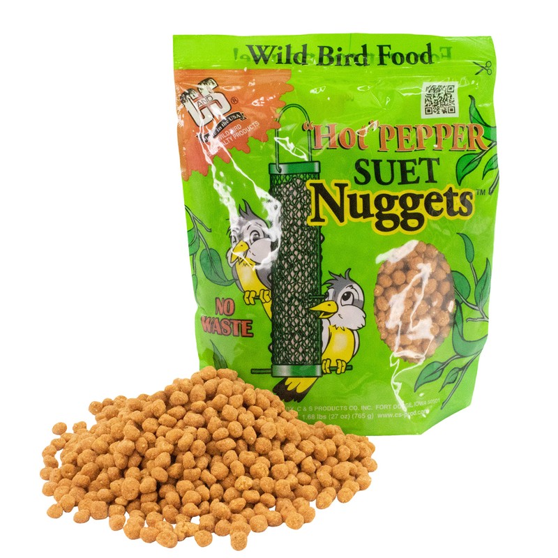Hot Pepper Suet Nuggets can be fed alone on a platform feeder or Nugget/Peanut/Sunflower feeder using 1/3" wire mesh. This formulation has a high-energy fat base and is processed even further to produce a soft nugget that is appealing to suet, insect and fruit eating songbirds . Ideal when mixed with 5-10 lbs. of seed in a traditional feeder. Resealable bag.