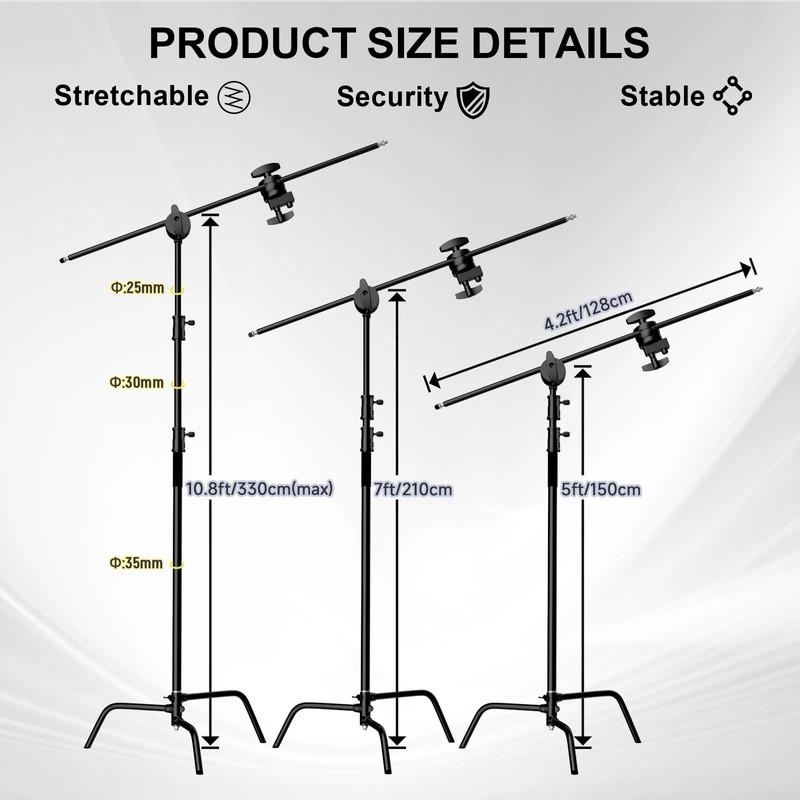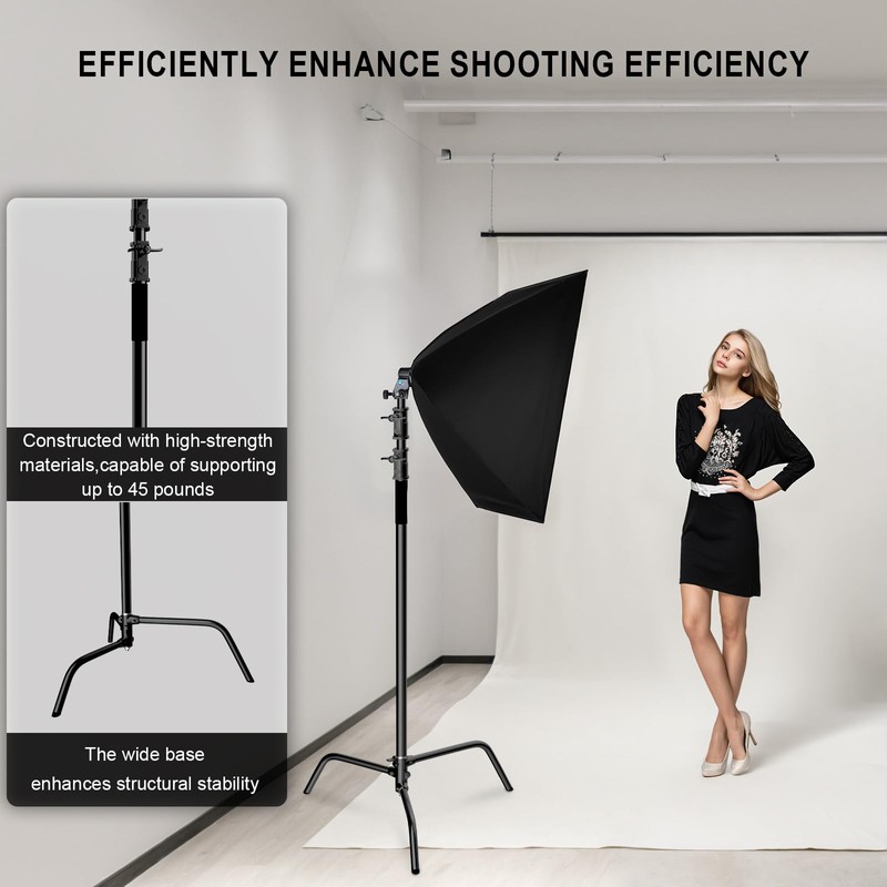 - Professional Studio Support: Premium stainless steel C Stand with maximum height of 10.8ft/330cm and 4.2ft/128cm boom arm. Supports up to 45lbs/20.4kg of studio equipment with rock-solid stability and precision locking system.