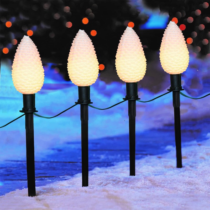 - Pinecone Christmas Pathway Lights Outdoor: 7Ft Christmas driveway markers pathway stake lights with 4 LED pinecone lights. Designed for outdoor Christmas decoration.